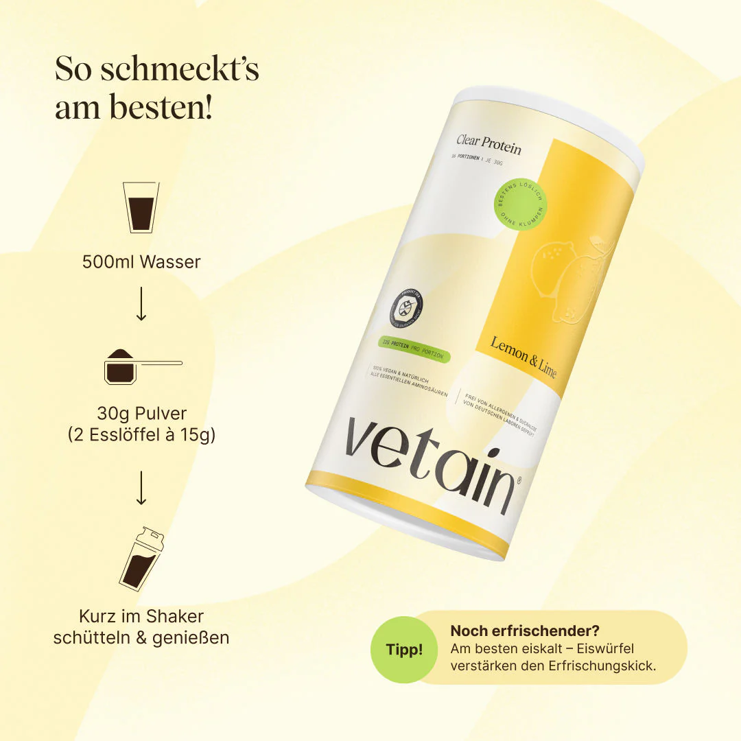 Das pflanzliche Clear Protein Lemon & Lime (480g) von Vetain ist ein pflanzliches Proteinpulver mit erfrischendem Zitronen-Limetten-Geschmack. Die leicht verdauliche Formel unterstützt eine vielseitige Ernährung und lässt sich einfach in Shakes oder Getränke mischen. Die klare, gelartige Textur sorgt für ein angenehmes Geschmackserlebnis ohne Trübung. Ideal für alle, die auf tierische Produkte verzichten möchten und Wert auf saubere, transparente Inhaltsstoffe legen. Mit dieser Mischung bringst du Abwechslung und Frische in deine Proteinzufuhr.