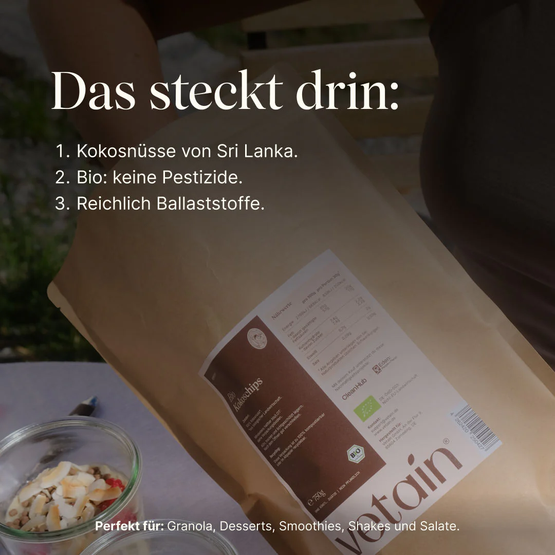 Bio Kokoschips geröstet – 750g von Vetain bieten knackigen Genuss aus 100 % kontrolliert biologischem Anbau. Die schonend gerösteten Chips sind ideal zum Snacken oder als Topping für Müsli und Desserts. Mit ihrem natürlichen Geschmack und der praktischen 750 g-Packung eignen sie sich perfekt für bewusste Genießer:innen, die Wert auf Qualität und Nachhaltigkeit legen.